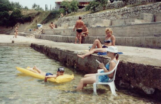 A teraz najważniejsze p l a ż a - kamienista, wybetonowana co umożliwia rozłożenie koca, wyposażona w ubikację i natrysk, utrzymana w czystości. Woda bardzo solana powodująca odkładanie się soli na rękach po wysuszeniu, czysta i spokojna. Kamienie znajdują się na dnie morskim ok. 3 m od brzegu potem piasek lub skała. Występują niezbyt uciążliwe wodorosty no i brak jeżowców i innych parzydełek co wcale nie zwalnia z używania obuwia do kąpieli - spora część kąpie się bez obuwia i ja też. Rano woda spokojna i z odpływem wieczorem lekkie fale i przypływ. Brak różnorodnych nowoczesnych zjeżdżalni i wypożyczalni.